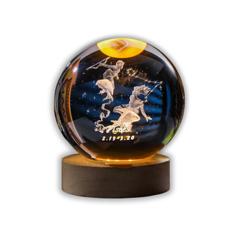 Intuitive, gentle, and deeply imaginative—ZenOrb Pisces reflects the soulful nature of this water sign through a stunning 3D crystal engraving. Featuring the iconic Pisces fish swimming in harmony, surrounded by delicate celestial accents, this orb glows with a soft white light that mirrors Pisces’ mystical and emotional depth.